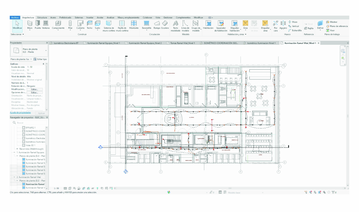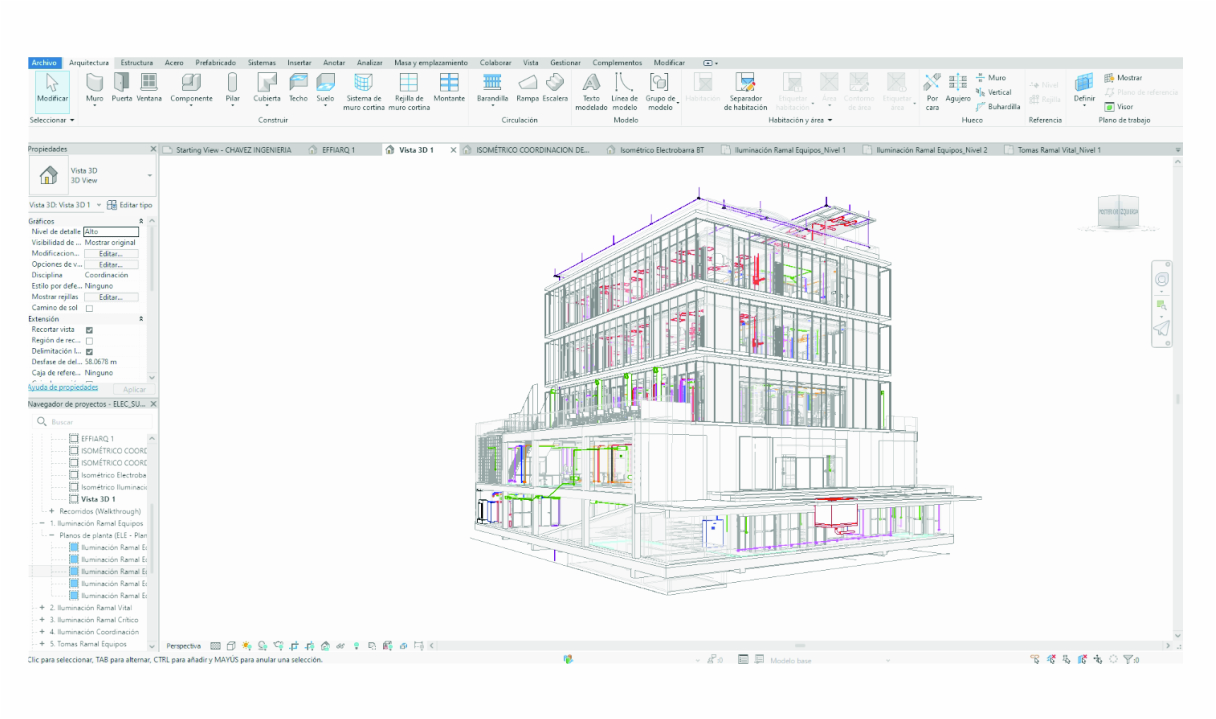 Modelado eléctrico: realizar el modelado de los sistemas eléctricos del proyecto, incluyendo la ubicación de los cables, interruptores, enchufes, luminarias y otros elementos eléctricos.