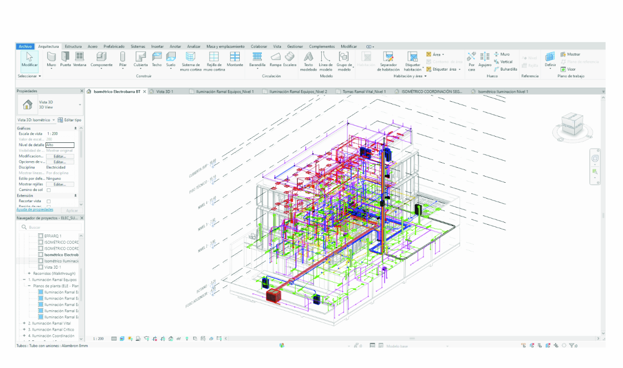 Modelado eléctrico: realizar el modelado de los sistemas eléctricos del proyecto, incluyendo la ubicación de los cables, interruptores, enchufes, luminarias y otros elementos eléctricos.